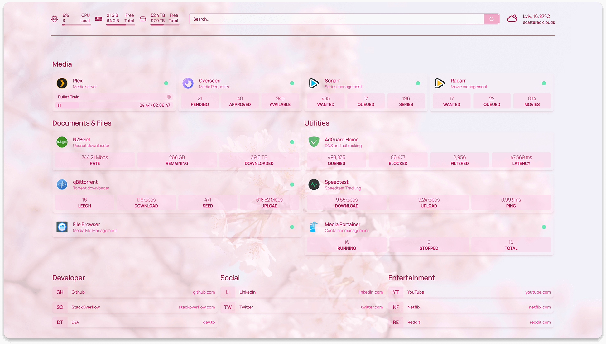 - Portainer, Traefik, Speedtest Tracker, PiHole, AdGuard Home, Nginx Proxy Manager, Gotify, Syncthing Relay Server, Authentik, Proxmox and more