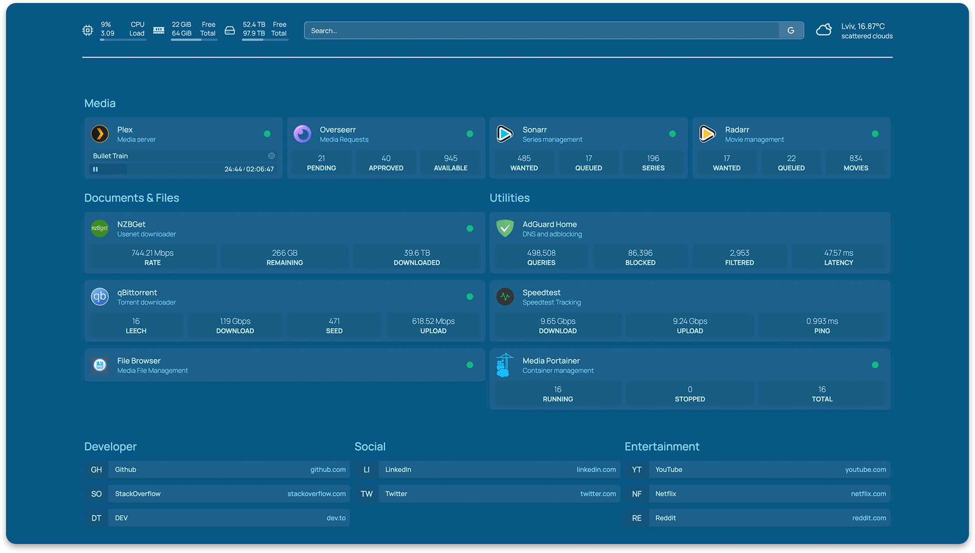 - Portainer, Traefik, Speedtest Tracker, PiHole, AdGuard Home, Nginx Proxy Manager, Gotify, Syncthing Relay Server, Authentik, Proxmox and more