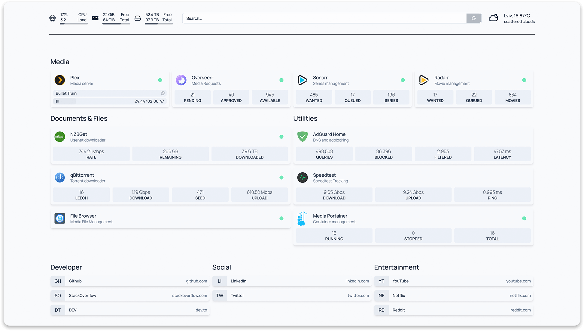 - Ombi, Overseerr, Jellyseerr, Jackett, NZBGet, SABnzbd, ruTorrent, Transmission, qBittorrent and more