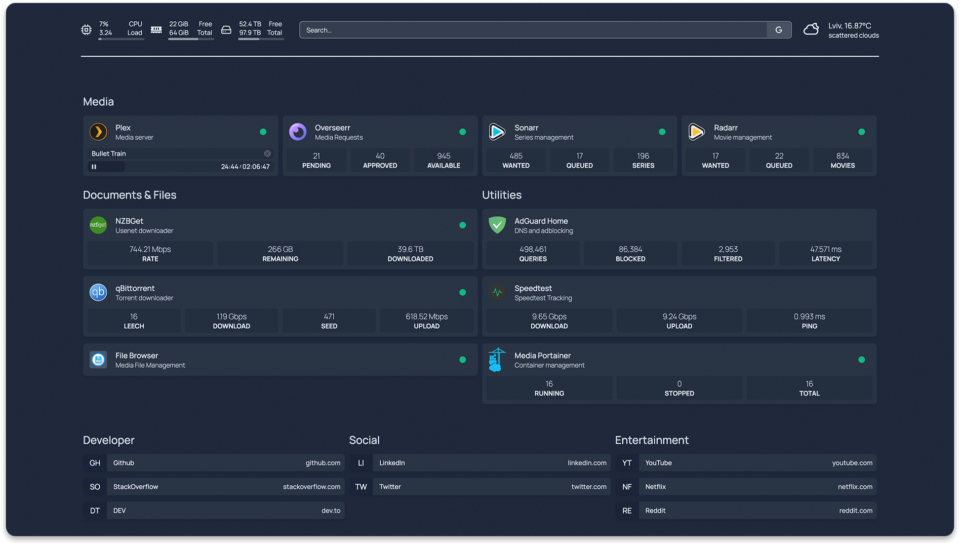 • Ombi, Overseerr, Jellyseerr, Jackett, NZBGet, SABnzbd, ruTorrent, Transmission, qBittorrent